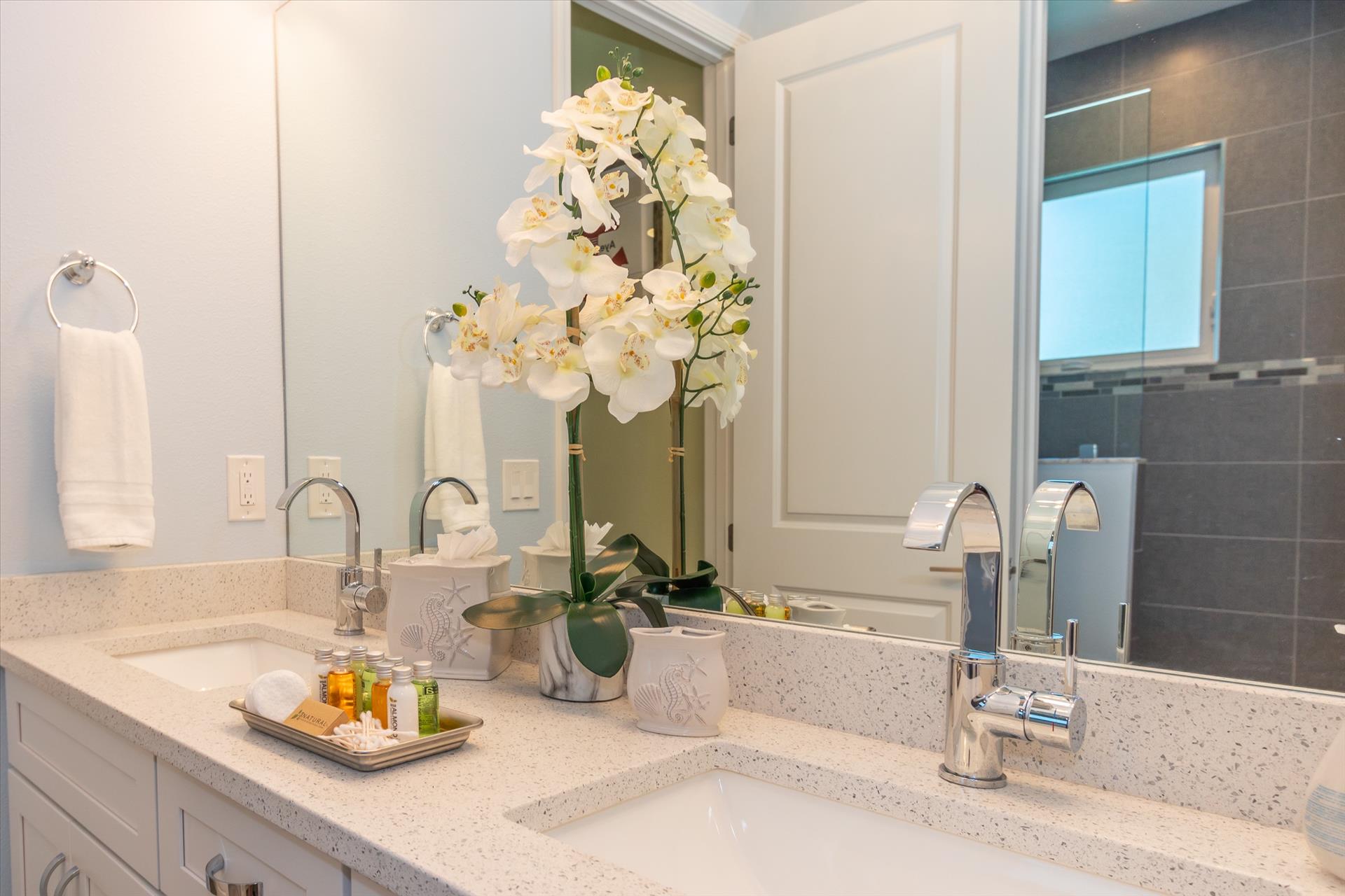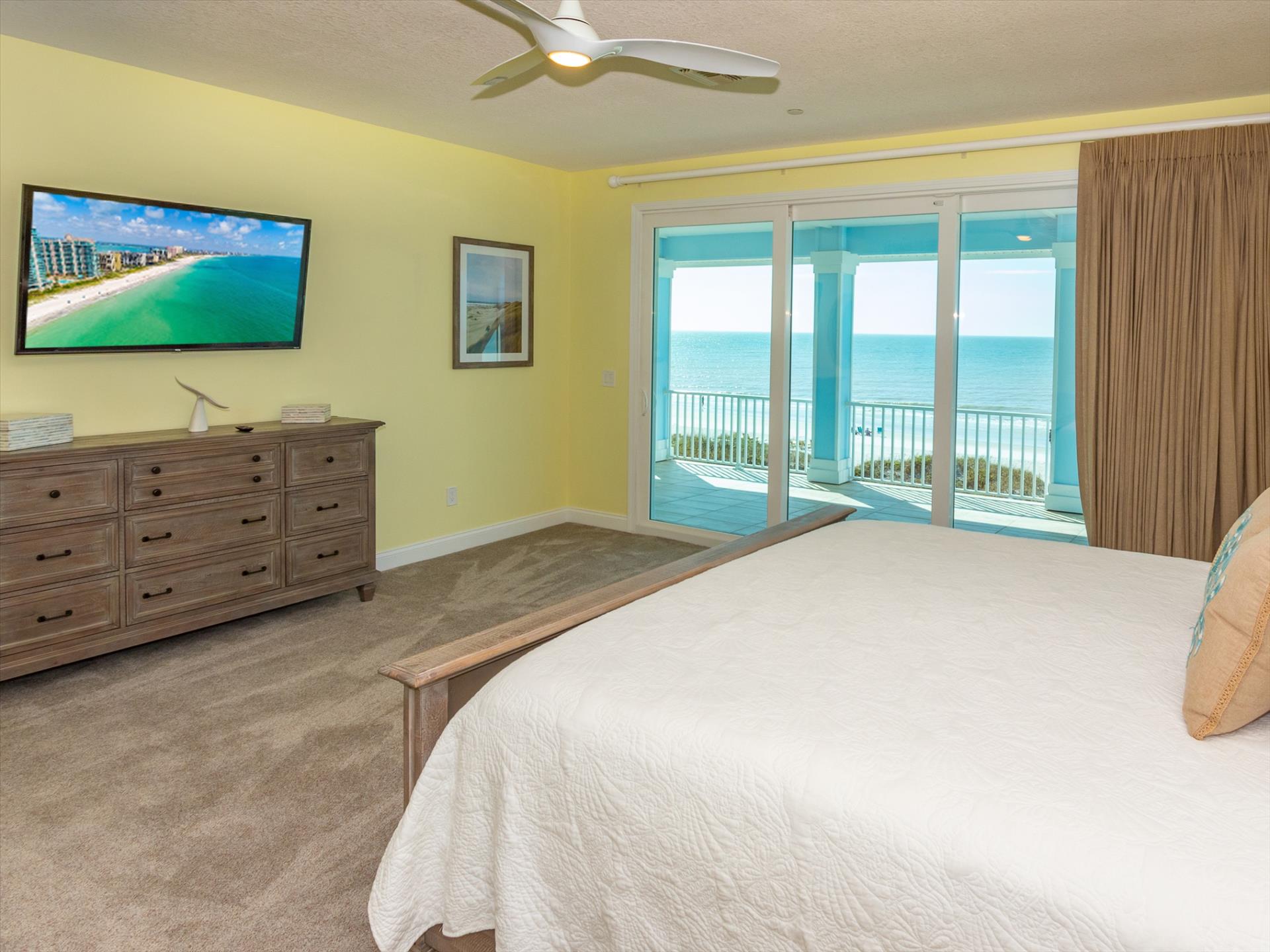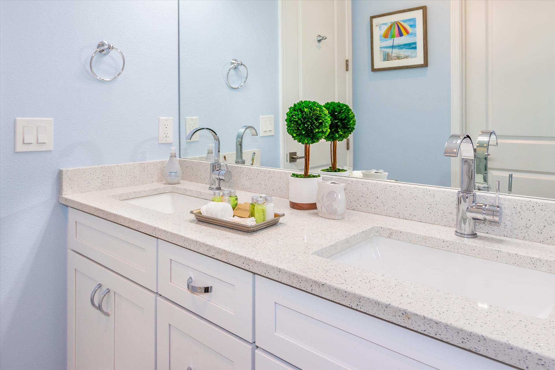 The third floor consists of the remaining 4 bedrooms. The master bedroom has a king bed and large walk in closet. The master bathroom features a soaking tub and separate walk in shower as well as a double sink/vanity unit. Bedroom 2 has a king bed and an en suite tub/shower combination. This bedroom and the master share a large balcony with incredible views of the beach and the Gulf of Mexico. The other two bedrooms on this floor share a Jack'n'Jill bathroom. One bedroom has a queen bed, the other a king bed. There is also a laundry room on the 3rd floor. All bedrooms have a flat screen smart TV.