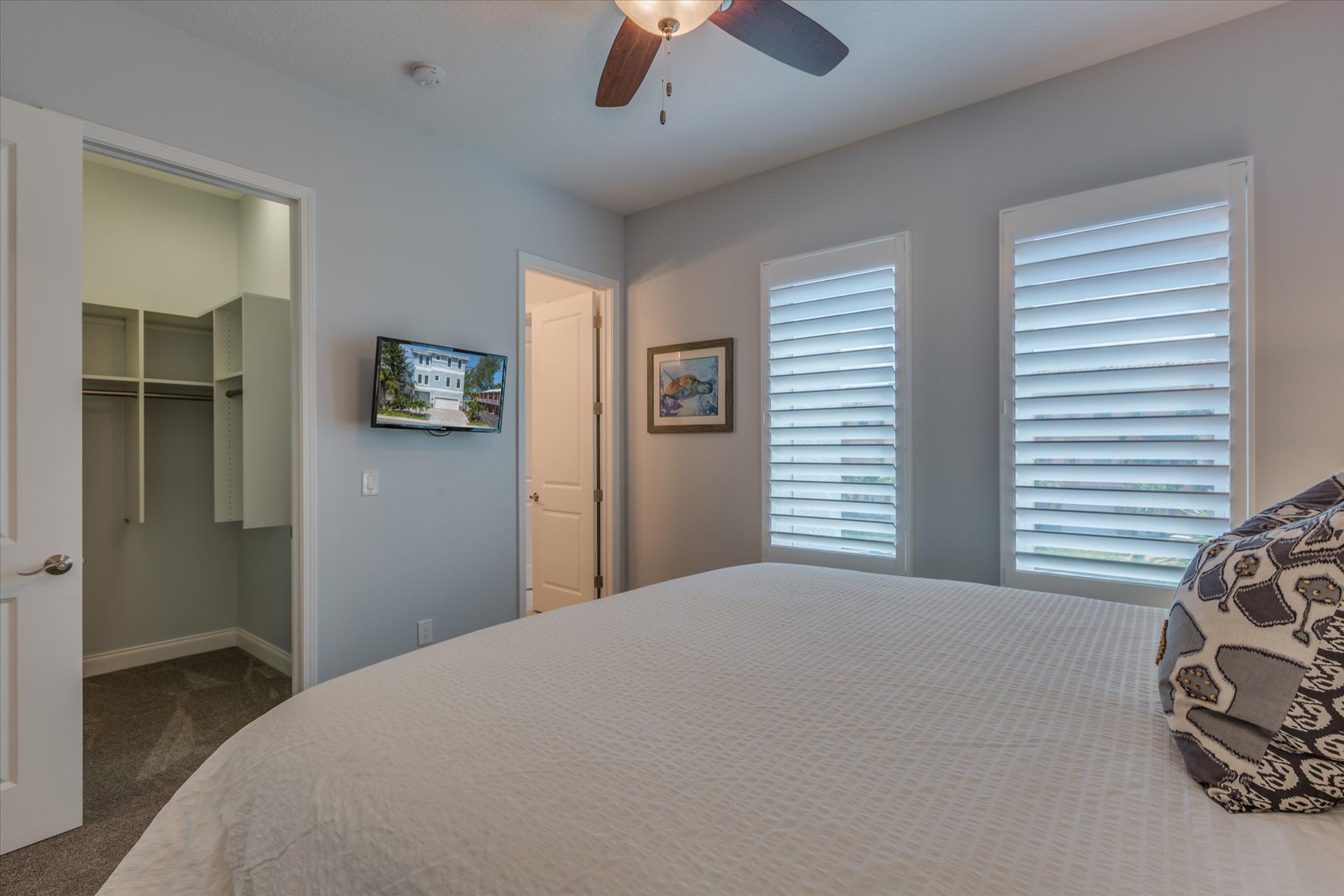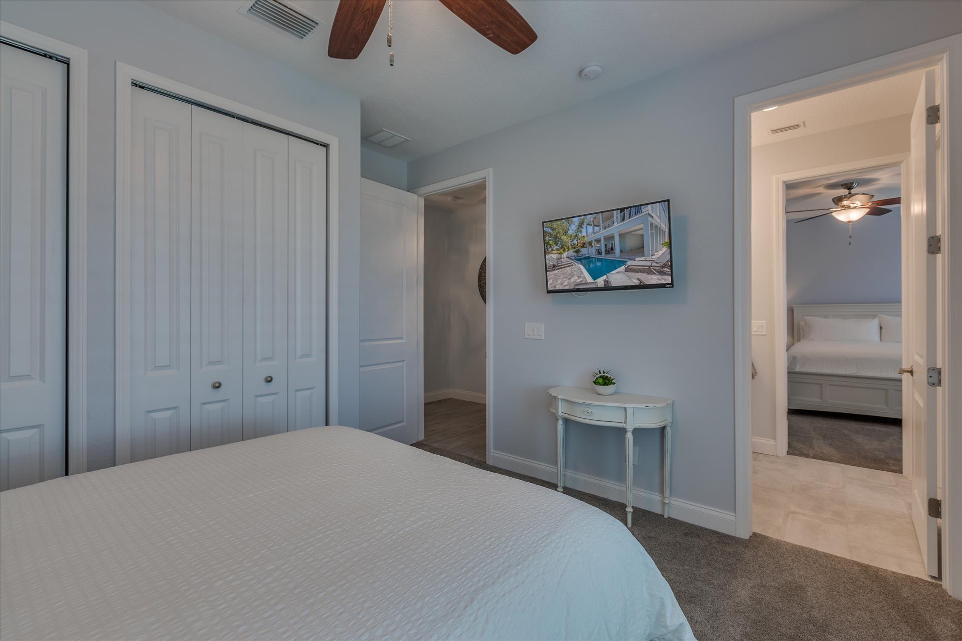 The other two bedrooms on this floor share a Jack'n'Jill bathroom. One bedroom has a queen bed, the other a king bed. There is also a laundry room on the 3rd floor. All bedrooms have a flat screen TV.