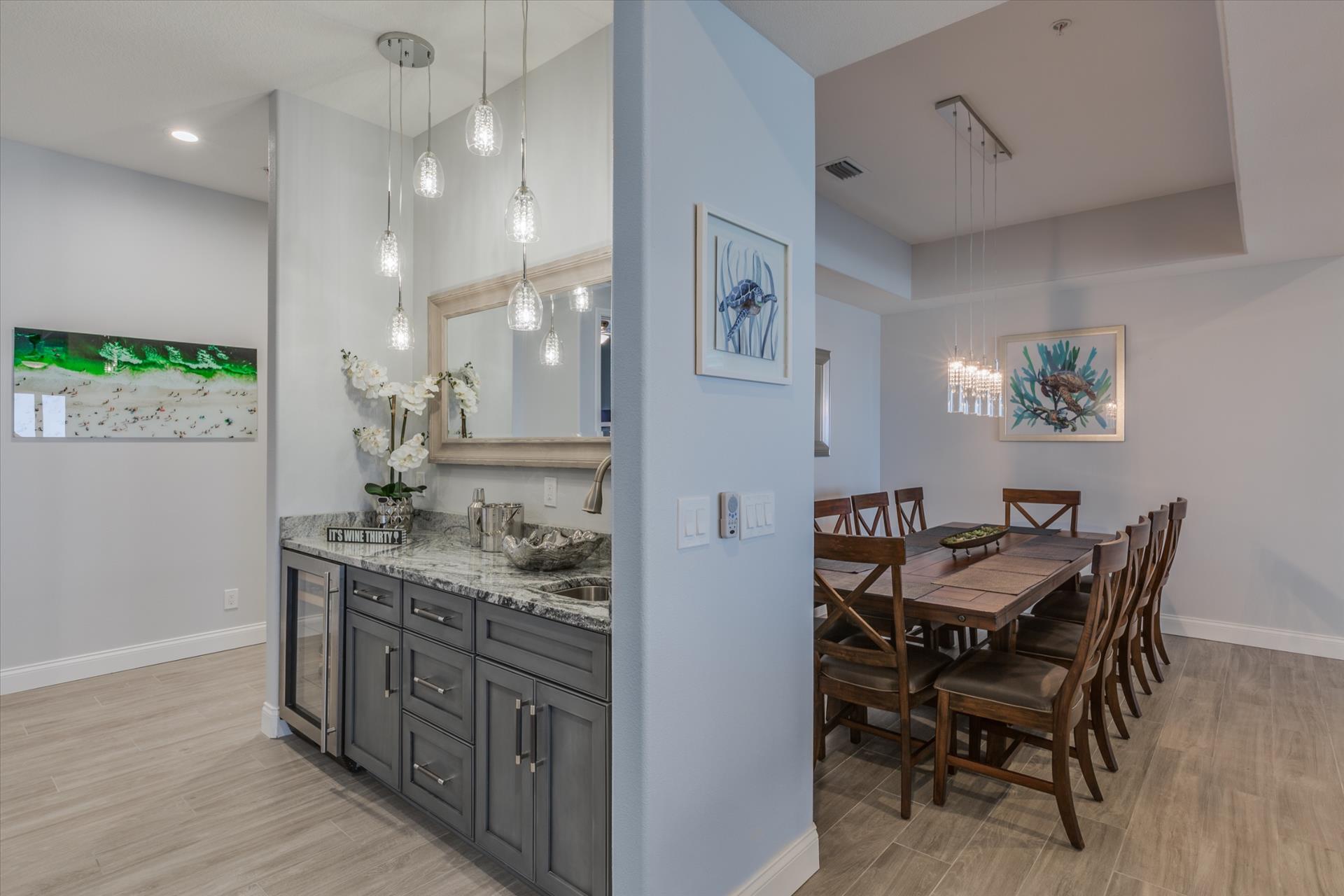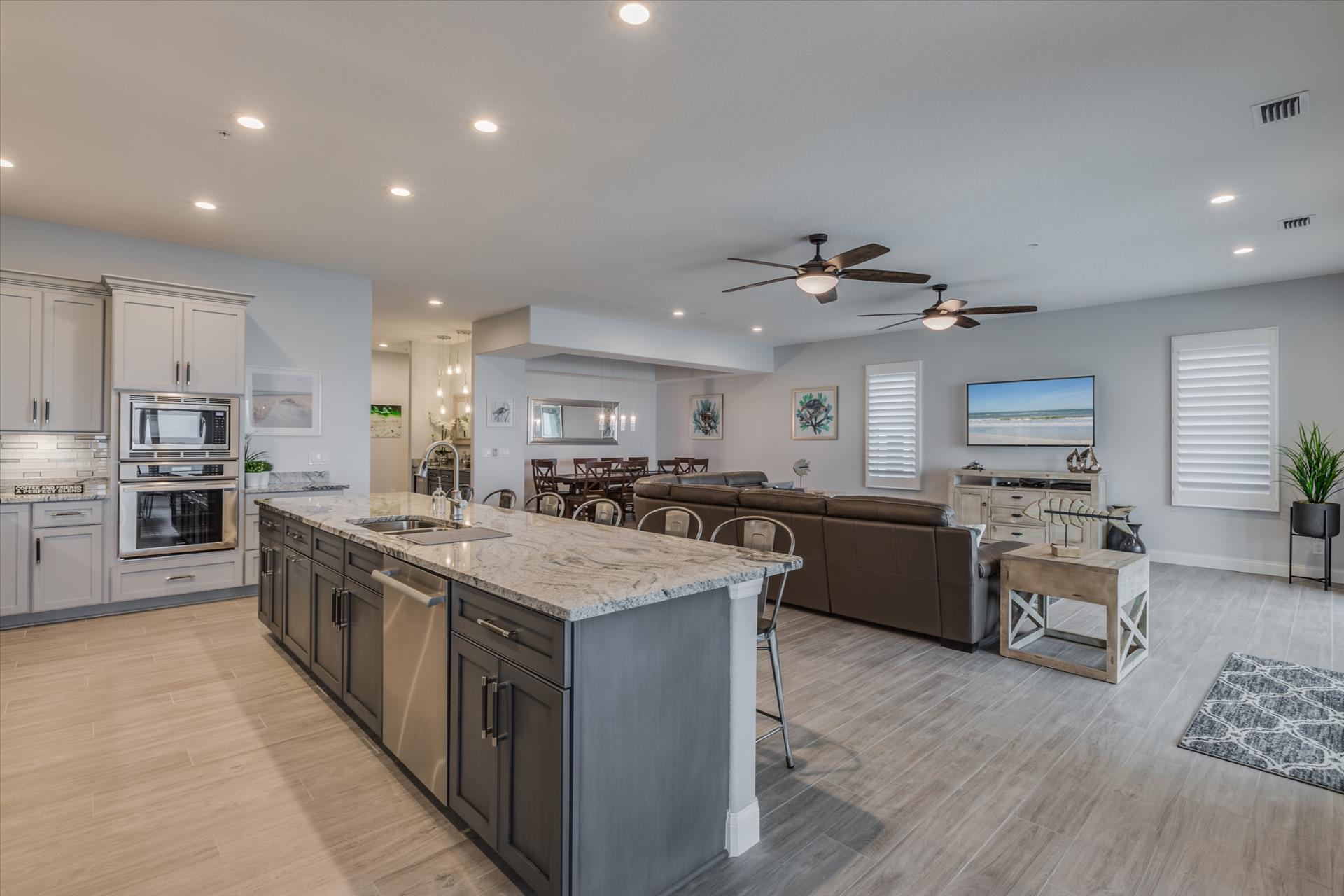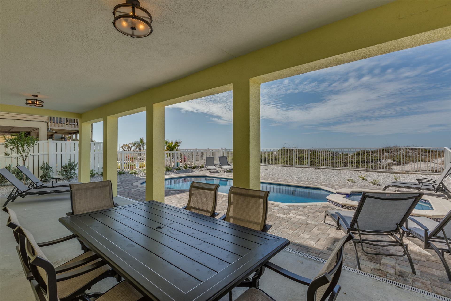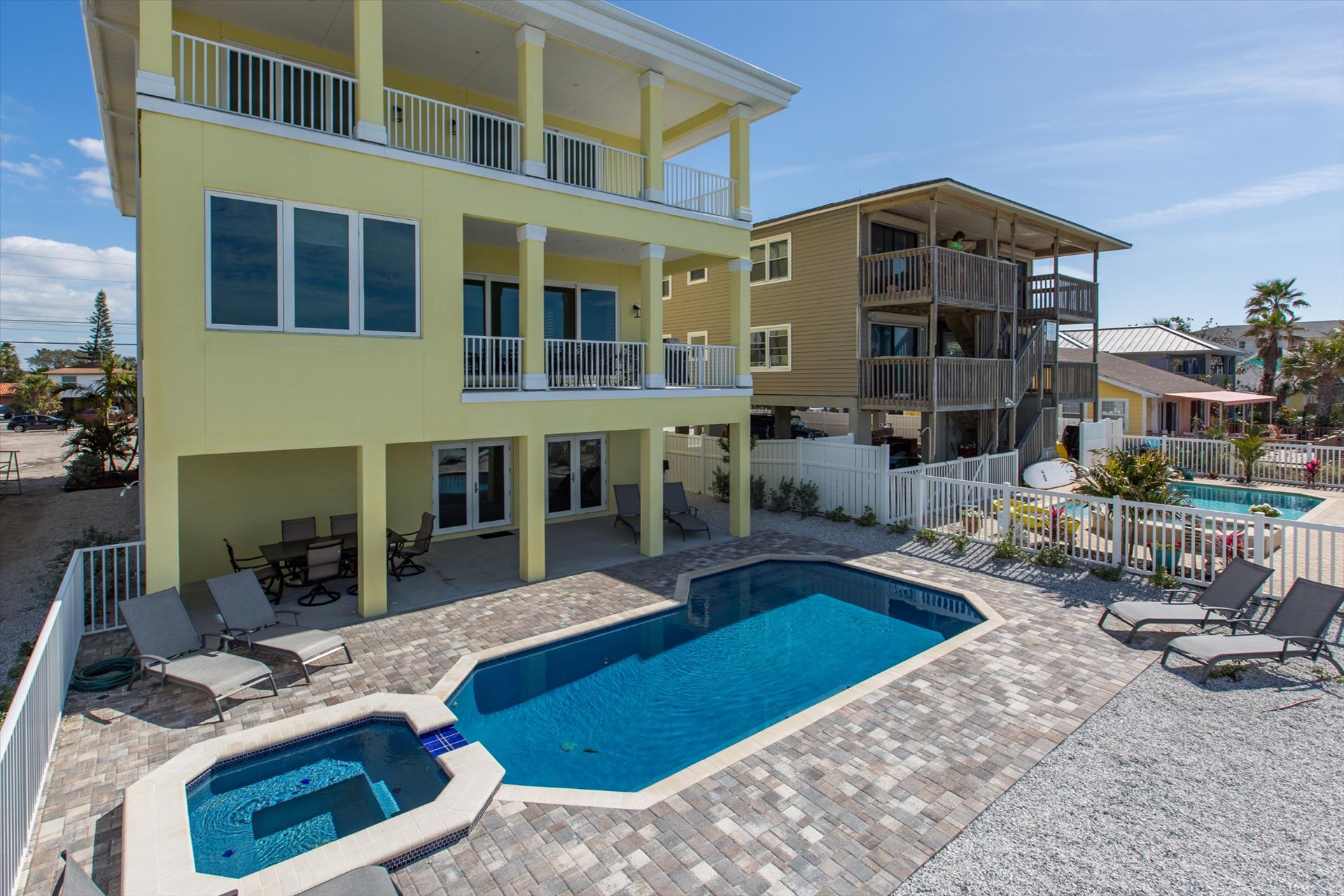 The rear of the property has a pool and hot tub, with sunbeds and seating for you and your party to relax in. There is also an outdoor shower for you to rinse off after a dip in the warm Gulf of Mexico which is just steps away. There are plenty of amenities and toys for your use. We have beach chairs and umbrellas, Paddle boards and Kayaks available for your use*. There is also a full crib, pack-n-play, high chair and baby gates for your convenience.