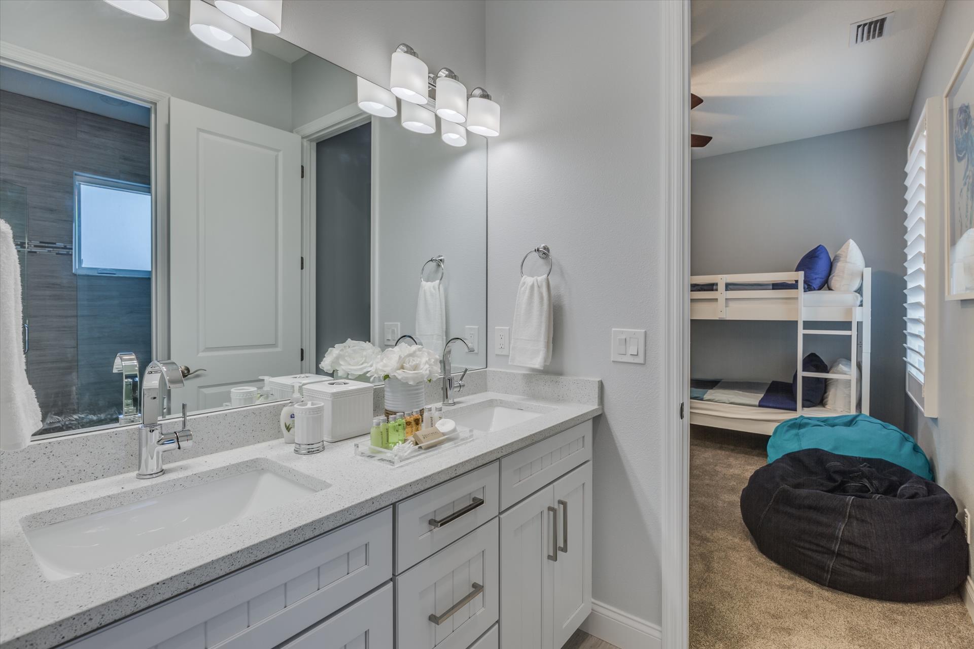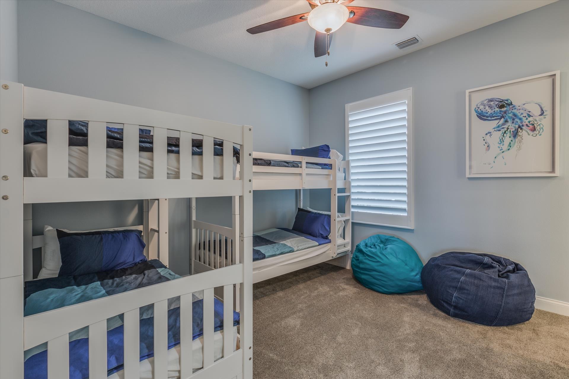 On this level there are two bedrooms, one with a king bed, the other with two sets of bunk beds, which will only accommodate children. These bedrooms share a Jack'n'Jill bathroom with shower. There is also a half bathroom for guests to use off of the living area.