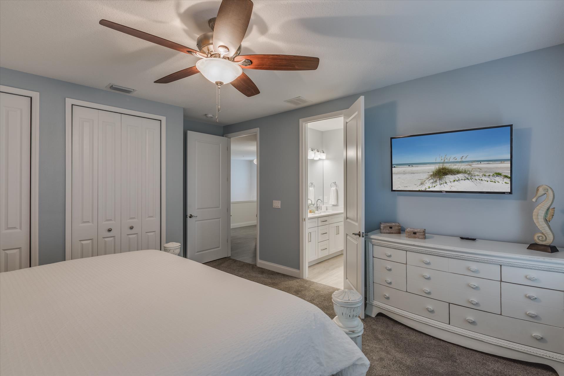 The other two bedrooms on this floor share a Jack'n'Jill bathroom. One bedroom has a queen bed, the other a king bed. There is also a laundry room on the 3rd floor. All bedrooms have a flat screen TV.